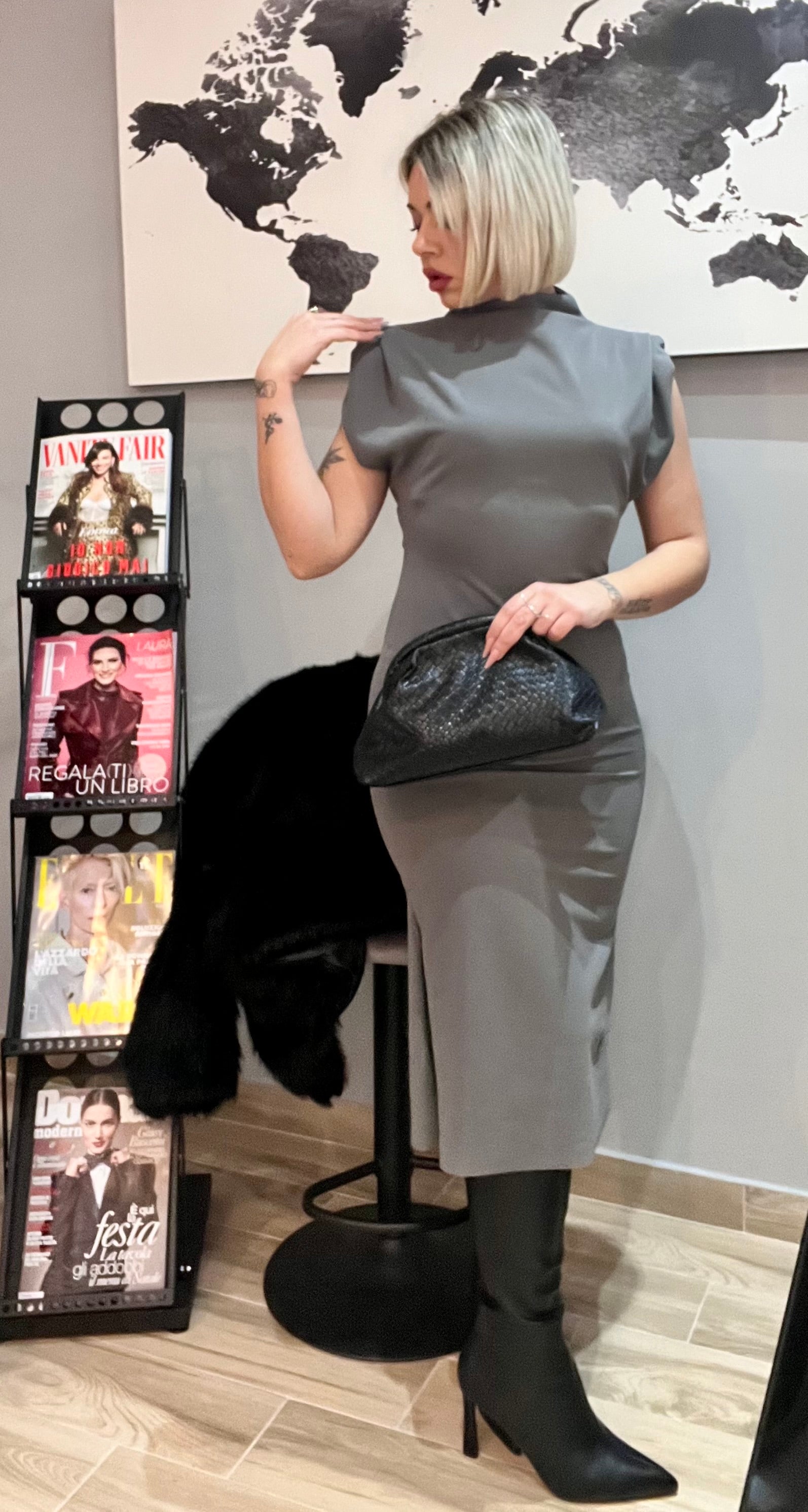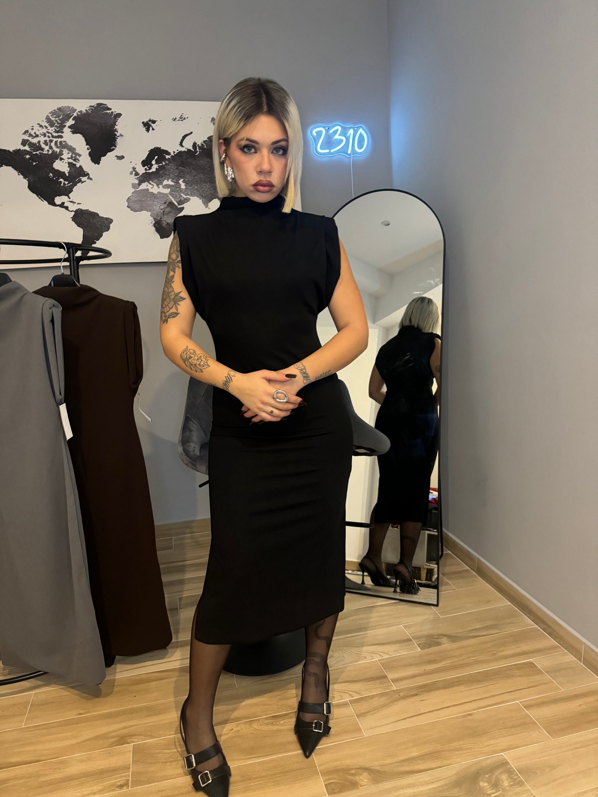 Abito lungo con spacco e spalline imbottite.